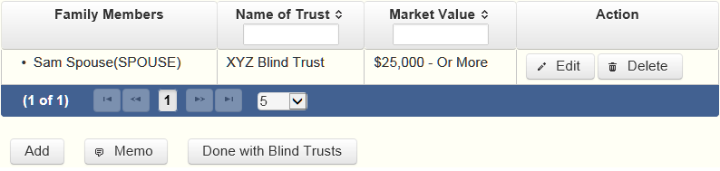 Blind Trusts List: After you enter and save your first blind trust, the filing application will begin a list of blind trusts entered on Part 10A for this PFS. The list will display columns showing each blind trust: