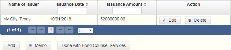The bond counsel services list will be the first screen you see each time you return to this part. From this list, you will be able to