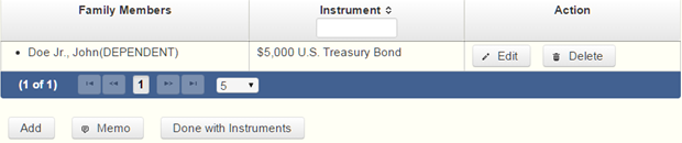 Financial Instrument List: After you enter and save your bond, note, or other commercial paper, the filing application will begin a list of financial instruments entered on Part 3 for this PFS. The list will display columns showing each financial instrument: