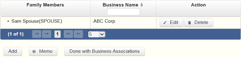 Complete this process for each business association in which you, your spouse, or a dependent child held, acquired, or sold 5 percent or more of the outstanding ownership. From this page you can add another business by clicking the