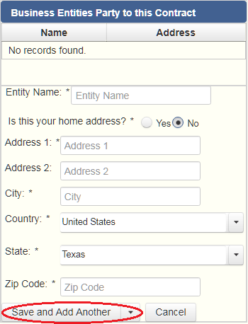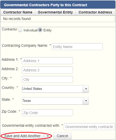 Enter whether the contractor is an individual or an entity. If the contractor is an individual, enter the contractor's name and address, then enter the governmental entity that the contractor has partnered with. If the contractor is an entity, enter the contractor company name and address, then enter the governmental entity that the contracting company has partnered with.