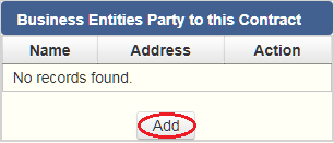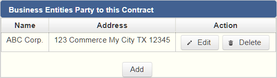 After you enter and save your first business in this table, the filing application will begin a list of all your businesses that are associated with this specific contract. The list will display columns showing pertinent information for each business you listed: