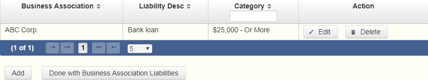 Business Associations List: After you enter and save the information regarding a business association, the filing application will begin a list of all such business associations entered on Part 11A for this PFS. The list will display columns showing pertinent information for the business association: