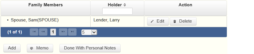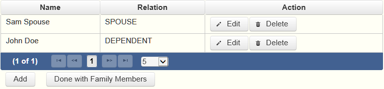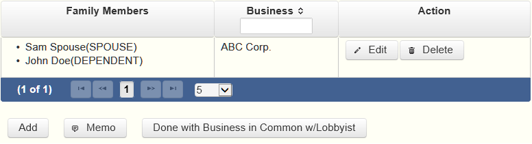 Family Members List: Click the Add button to enter information about a family member for whom you will be reporting financial activity. After you enter and save your first family member, the application will begin a list of all family members on this section of the report. The list will display columns showing each family member: