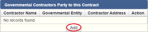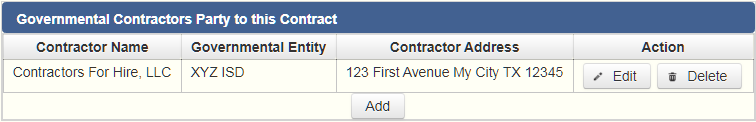 After you enter and save your first contractor for this specific contract in this table, the filing application will begin a list of all your contractors party to this specific contract. The list will display columns showing pertinent information for each contractor you listed: