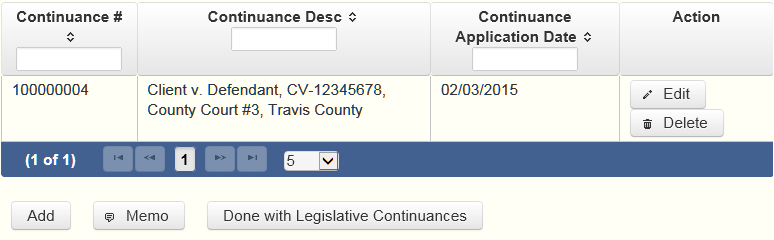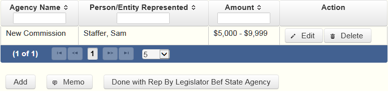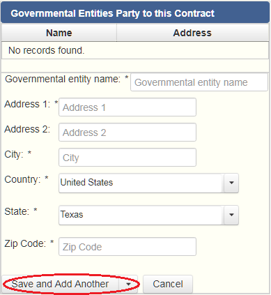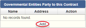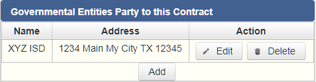 After you enter and save your first government entity for this specific contract in this table, the filing application will begin a list of all your government entities party to this specific contract. The list will display columns showing pertinent information for each government entity you listed: