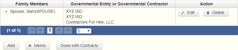 Contracts List: After you enter and save your first contract with a governmental entity, the filing application will begin a list of all contracts entered on Part 19 for this PFS. The list will display columns showing pertinent information for each contract: