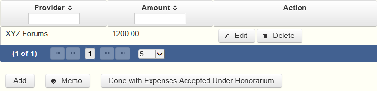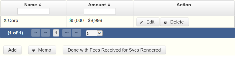 Retainers List: After you enter and save your first retainer, the filing application will begin a list of all retainers entered on Part 1B for this report. The list will display columns showing each person providing a retainer:
