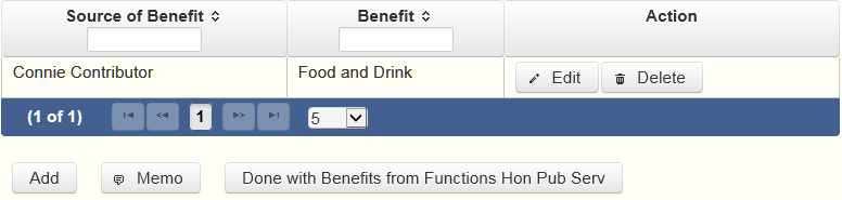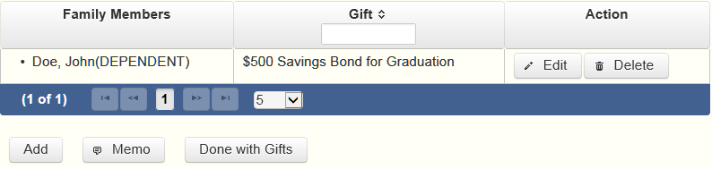 Gift List: After you enter and save your first gift, the filing application will begin a list of the gifts entered on Part 8 for this PFS. The list will display columns showing each gift:
