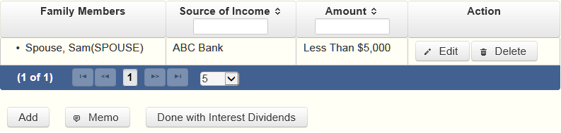 Sources of Income List: After you enter and save your first source of income from interest, dividends, royalties, or rents, the filing application will begin a list of such properties entered on Part 5 for this PFS. The list will display columns showing each source of income: