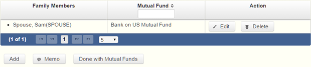 Mutual Funds List: After you enter and save your first mutual fund, the filing application will begin a list of mutual funds entered on Part 4 for this PFS. The list will display columns showing each mutual fund:
