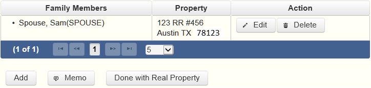 Real Property List: After you enter and save the first piece of real property in which you, your spouse, or a dependent child held or acquired a beneficial interest, the filing application will begin a list of such properties entered on Part 7A for this PFS. The list will display columns showing each property: