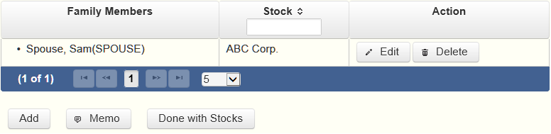 Stocks List: After you enter and save your first stock, the filing application will begin a list of all stocks entered on Part 2 for this report. The list will display columns showing each stock: