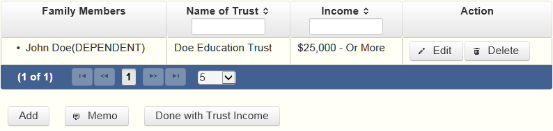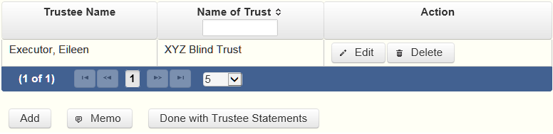Trusts List: After you enter and save your first trust, the filing application will begin a list of trusts entered on Part 9 for this PFS. The list will display columns showing each trust: